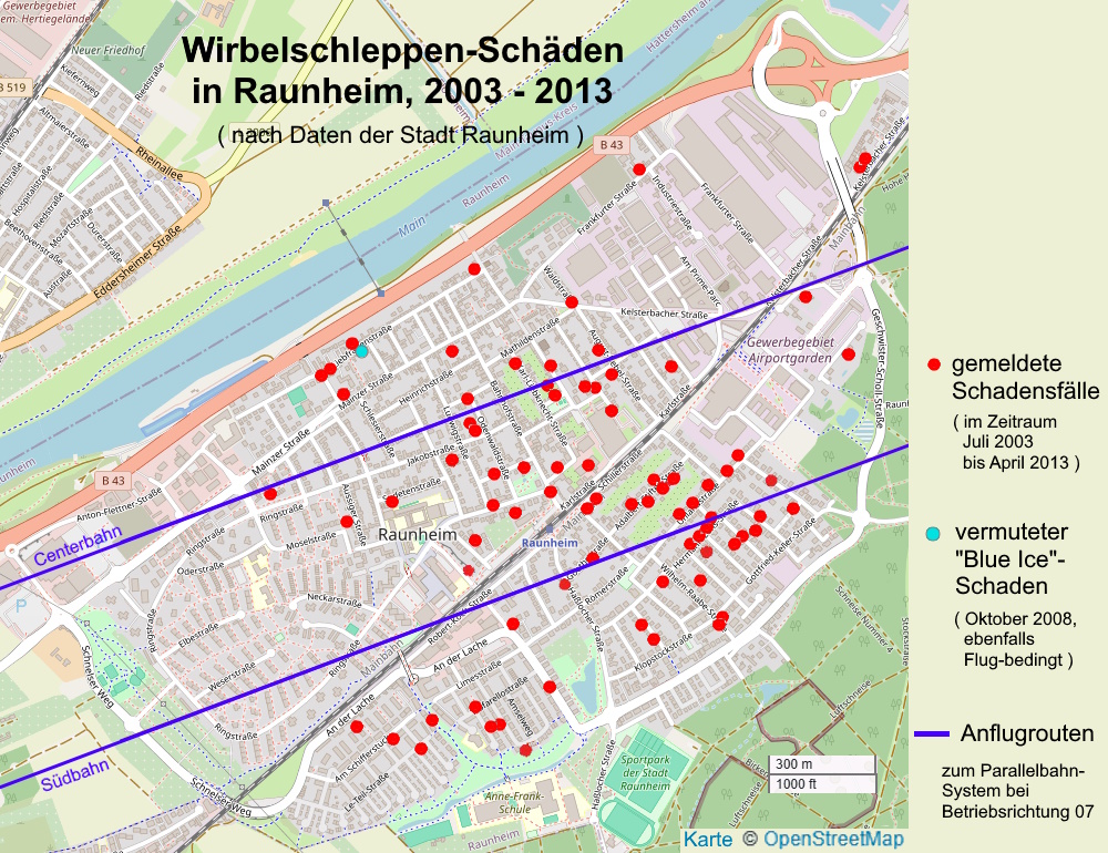 Die in Raunheim als "nicht plausibel" bewerteten Fälle liegen allesamt in Bereichen, in denen bereits Wirbelschleppen-bedingte Schäden aufgetreten sind.